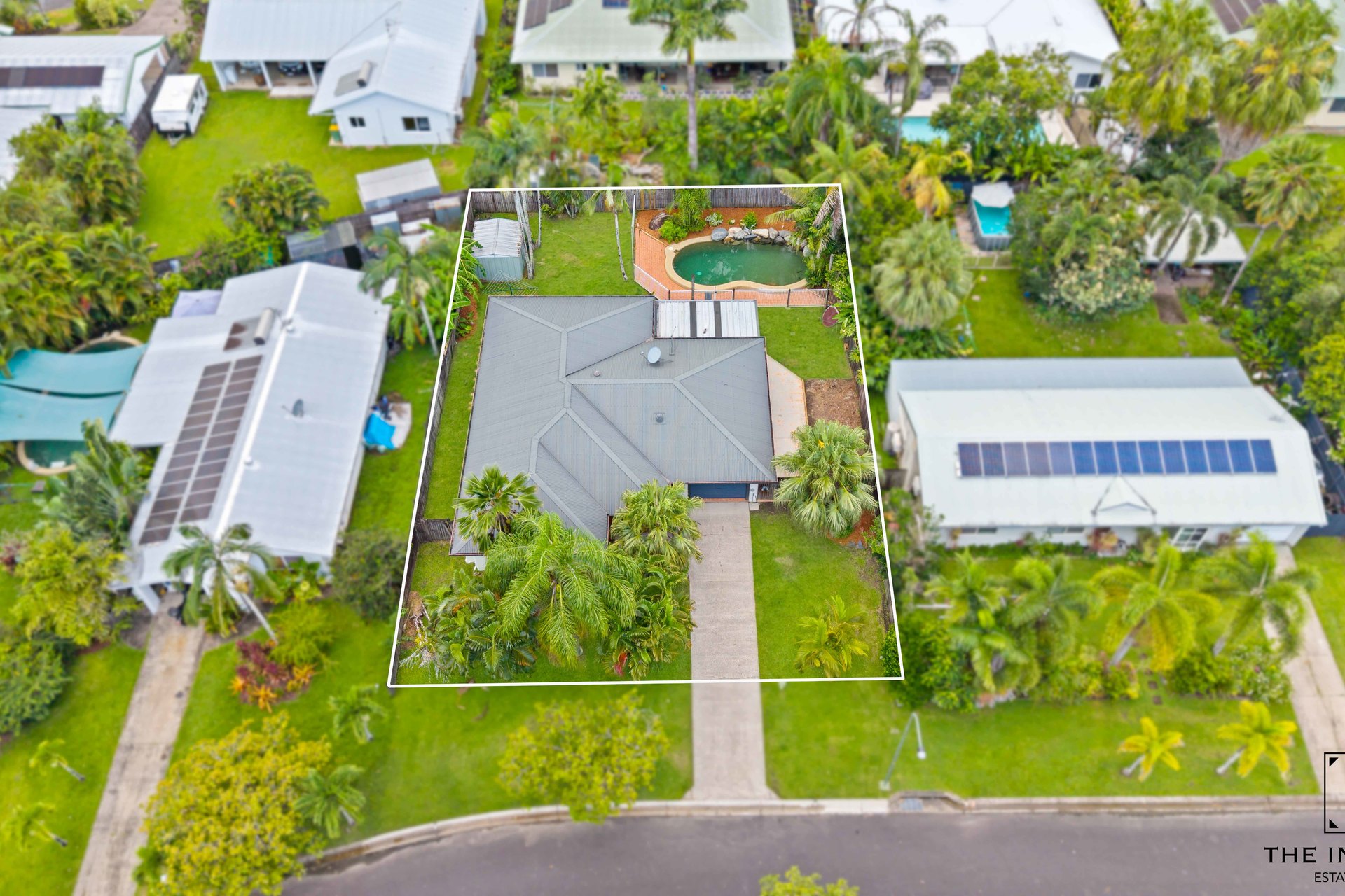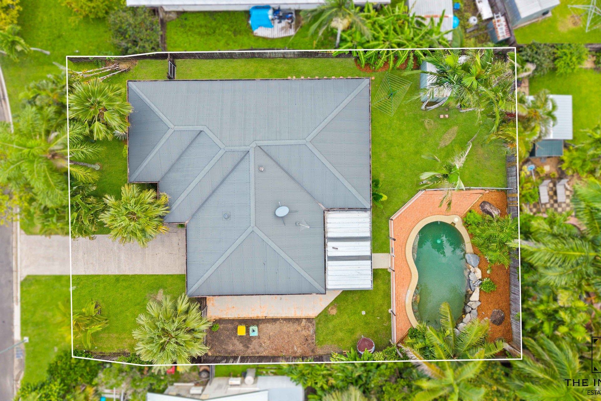 – Sparkling in ground swimming pool with lush, tropical surrounds, garden shed
