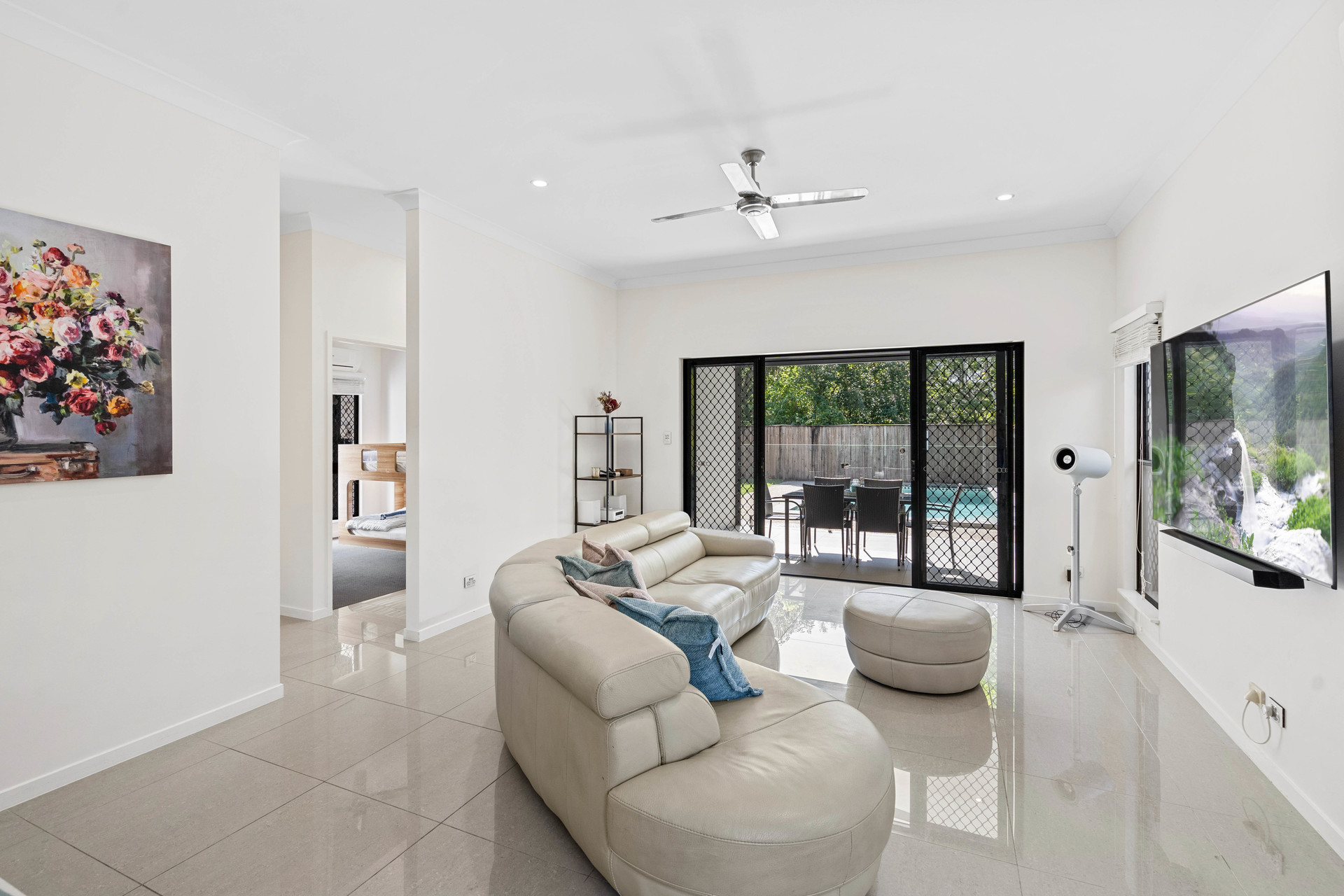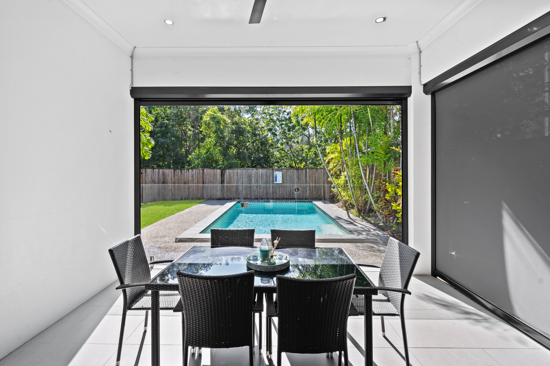 – Sparkling swimming pool, patio electric blinds