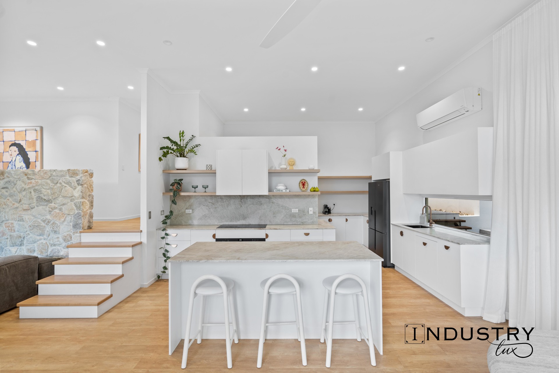 – Split systems & fans throughout.