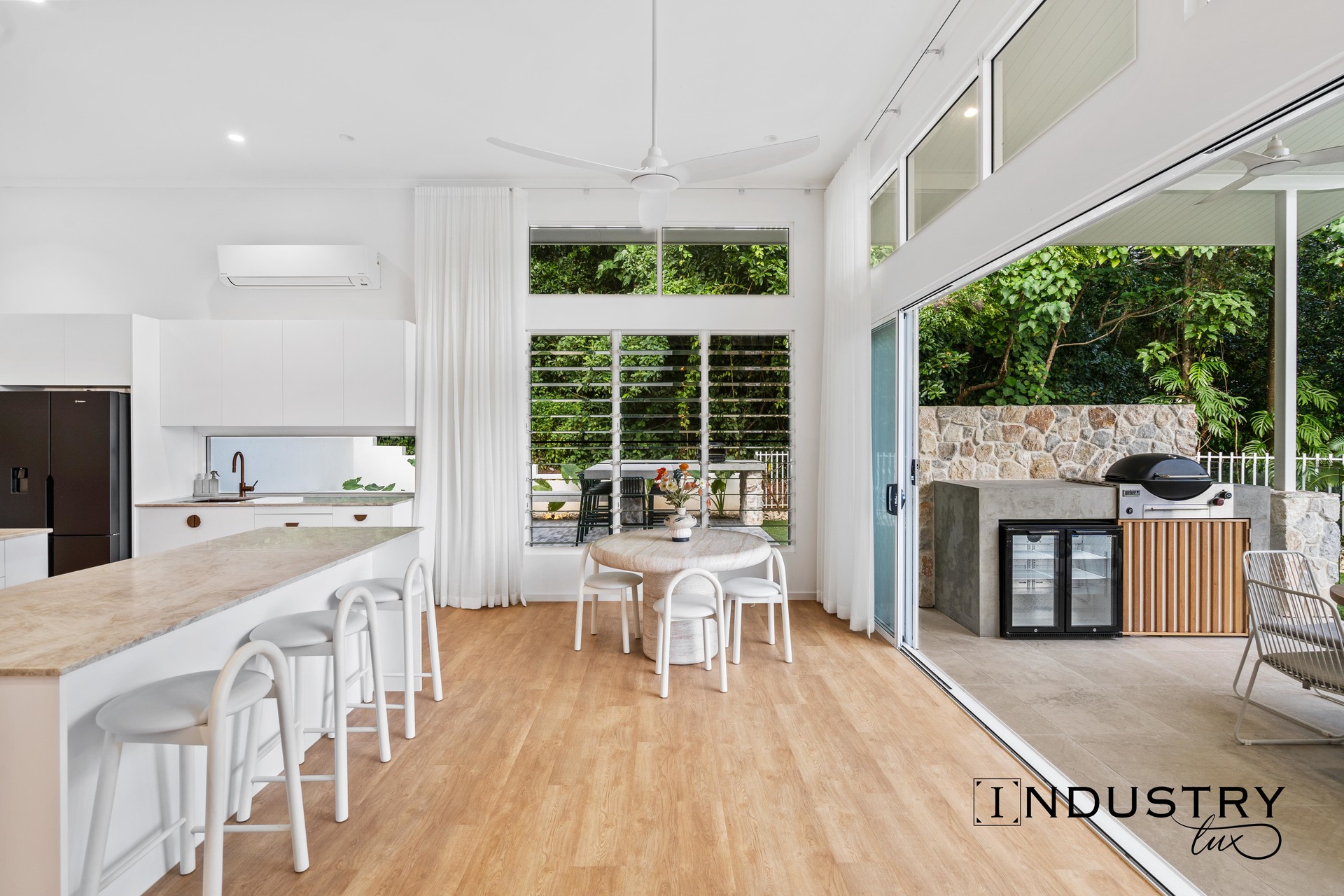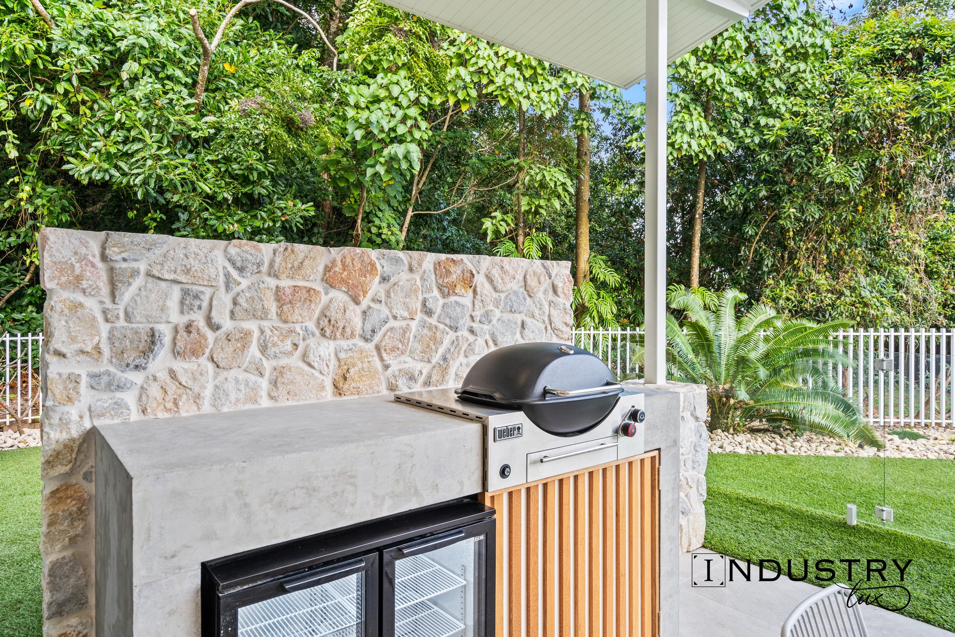 – Impressive built-in Weber BBQ setup featuring a sleek concrete benchtop and double-door bar fridge.