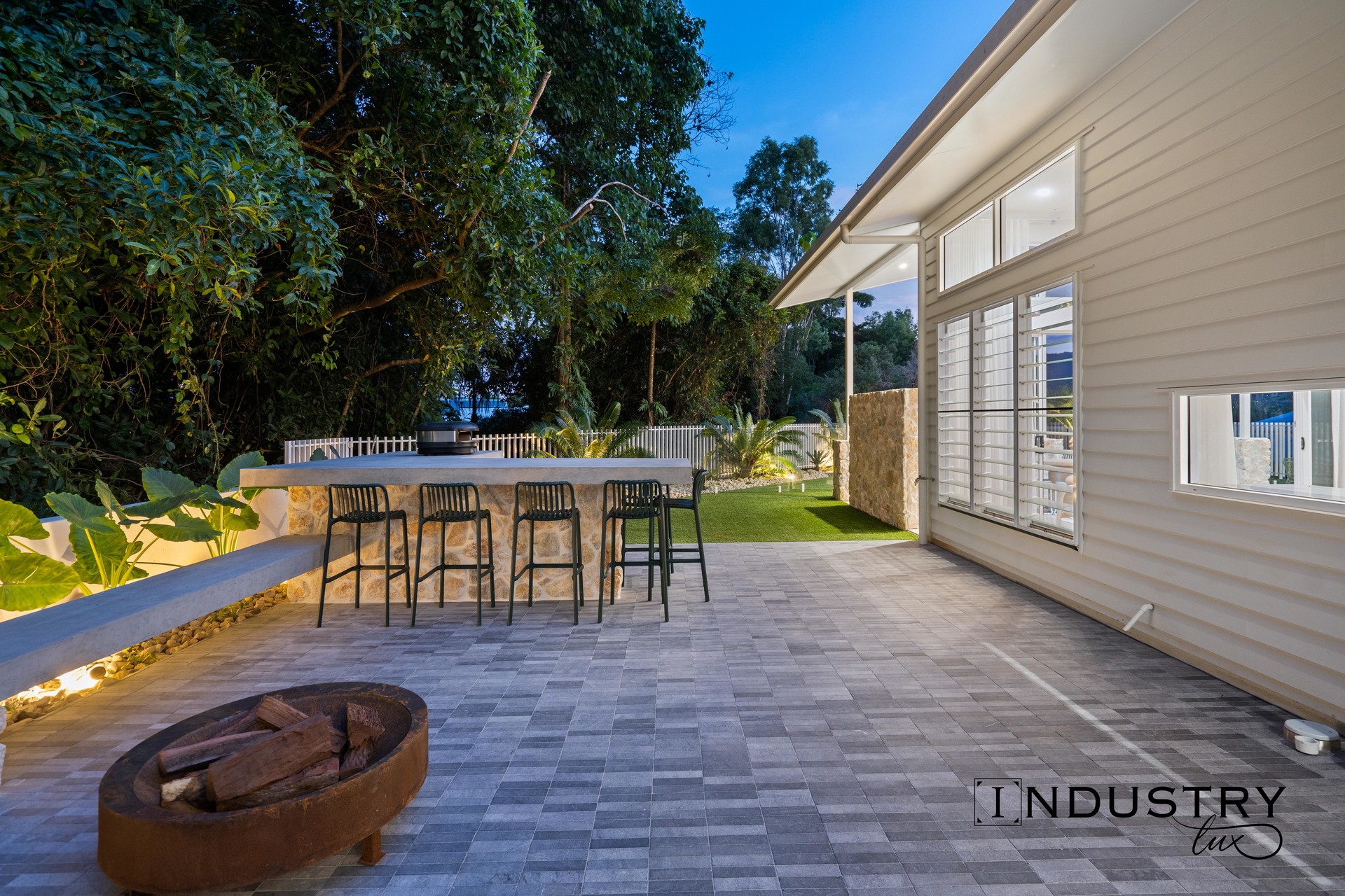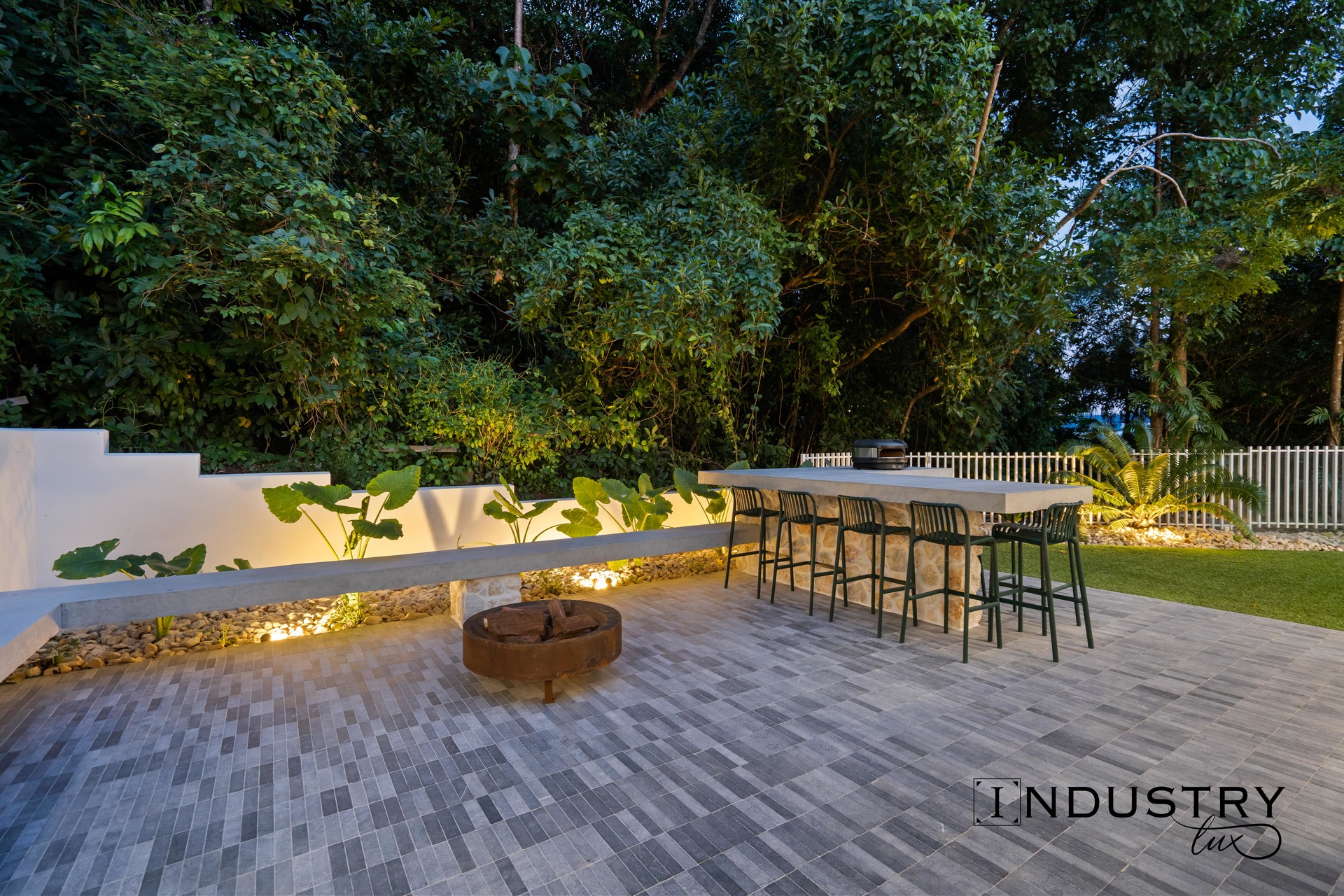 – Separate entertaining zone with a fire pit, built in concrete bench seating, and a massive bar height concrete bench.