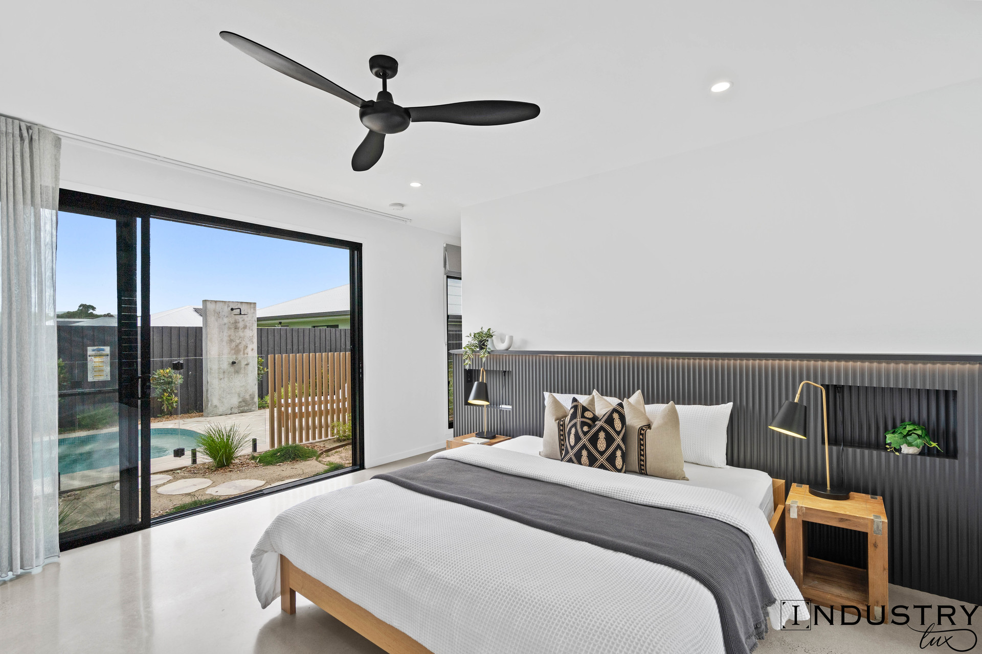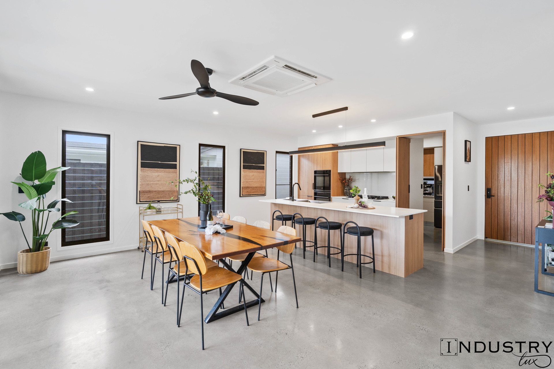 The heart of the home is the open plan kitchen, dining and living area, featuring polished concrete floors, soft timber look cabinetry and a generous stone island bench. Designed to be both practical and inviting, the space flows seamlessly to the covered alfresco area, complete with a built in outdoor kitchen.