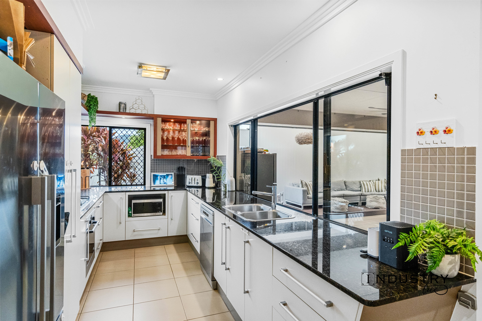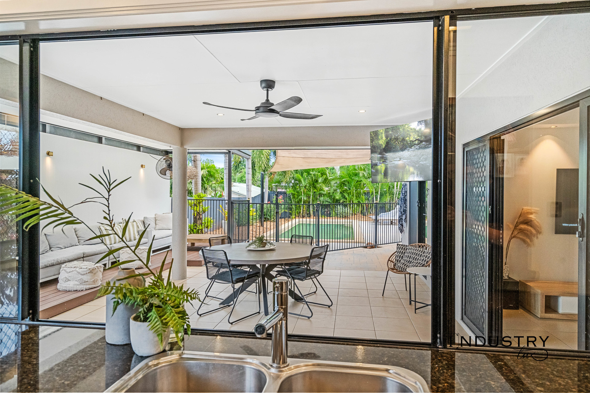 The kitchen sits at the heart of the home, offering ample storage and overlooking the expansive outdoor entertainment area. This home flows seamlessly between indoor and outdoor, creating a welcoming space for everyday living and entertaining.
