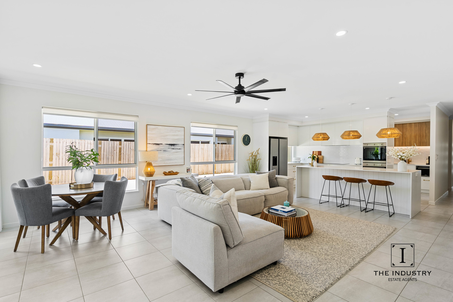 The crisp white walls, high-end finishes, and sleek modern design create a fresh and inviting feel. Thoughtfully placed plantation shutters, VJ board feature cladding in the kitchen, and a second living area add a touch of coastal Hamptons charm. The open plan design flows seamlessly from the bright, airy kitchen highlighted by elegant bronze fixtures into the spacious living area.