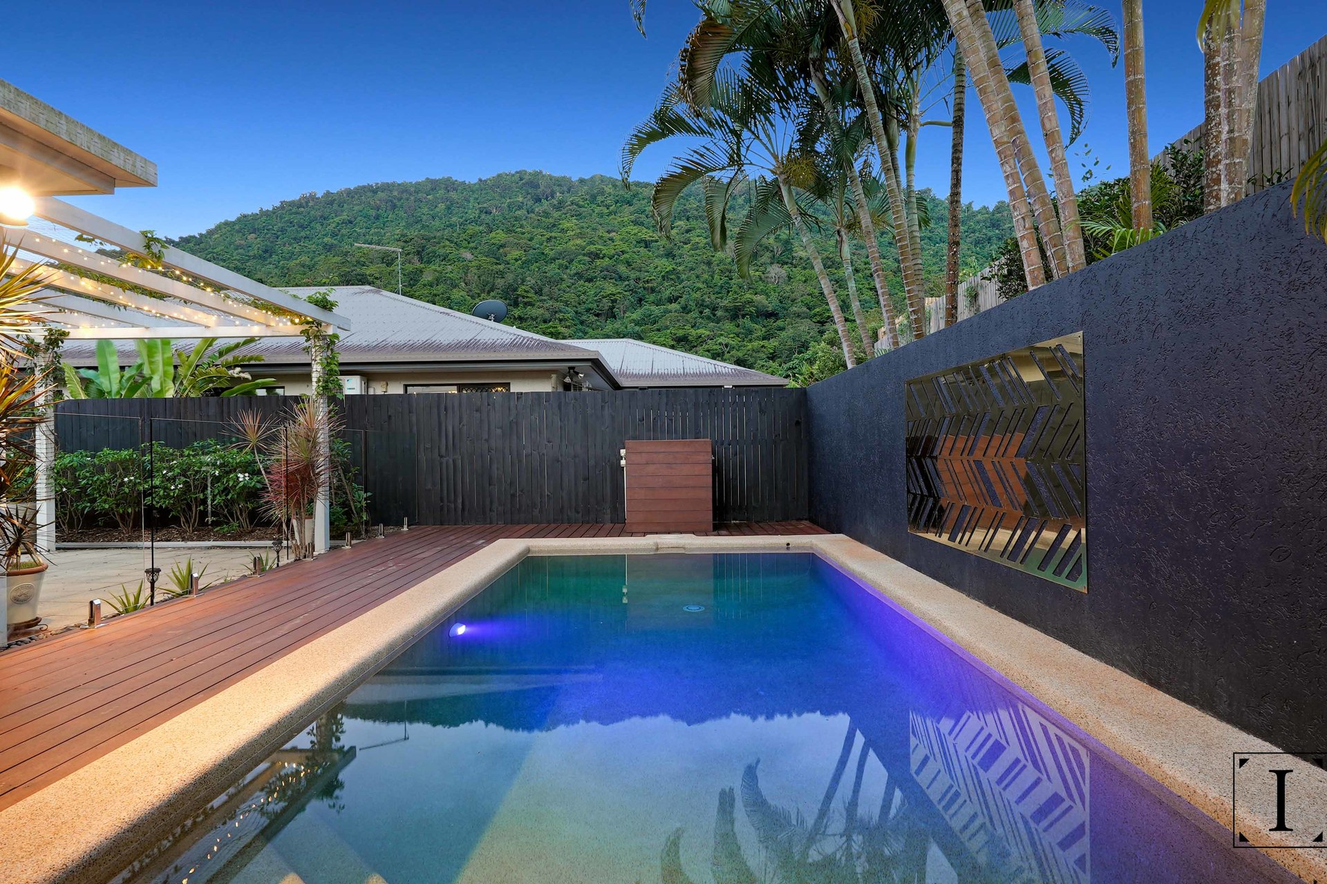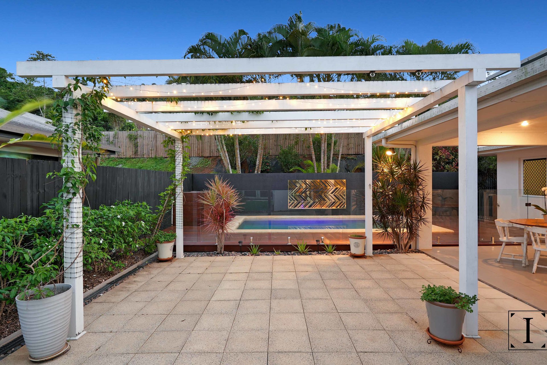 – Sparkling inground swimming pool with glass fencing and pool side pergola