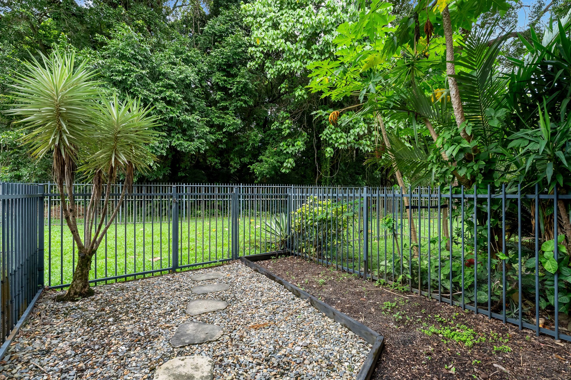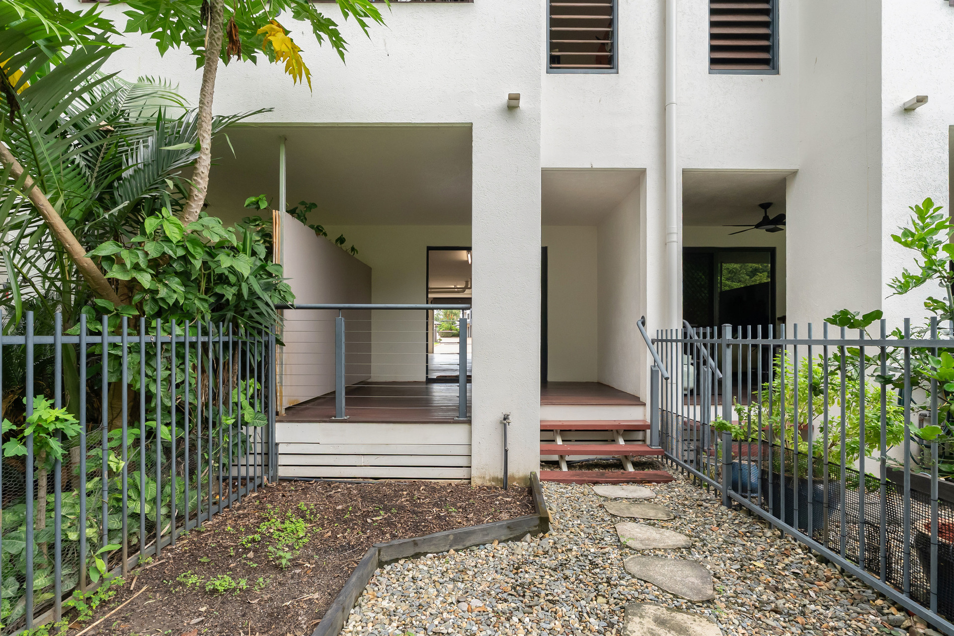 – Private downstairs gated courtyard with timber decking and low maintenance garden bed